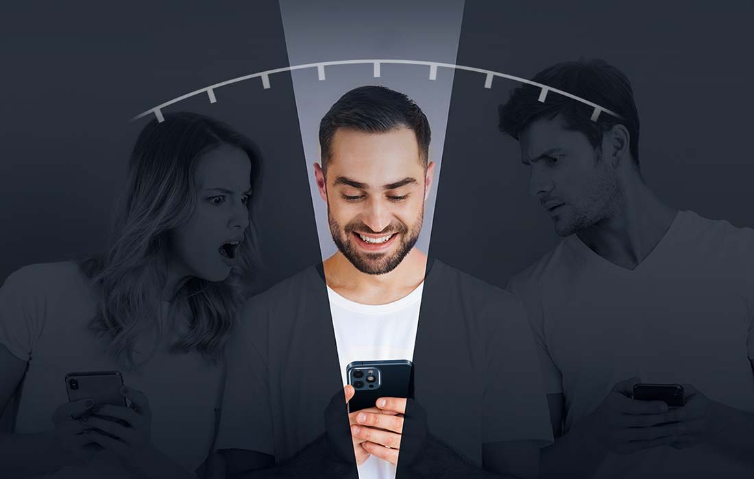 Seien Sie sicher, dass niemand ahnt, was Sie mit Ihrem Telefon tun. Dank des gehärteten Glases mit getöntem Filter ist das Bild auf Ihrem Smartphone-Bildschirm nur in einem Winkel von bis zu 28° sichtbar. Während Sie alles perfekt sehen, sehen die Menschen neben Ihnen nur ein dunkles Display!