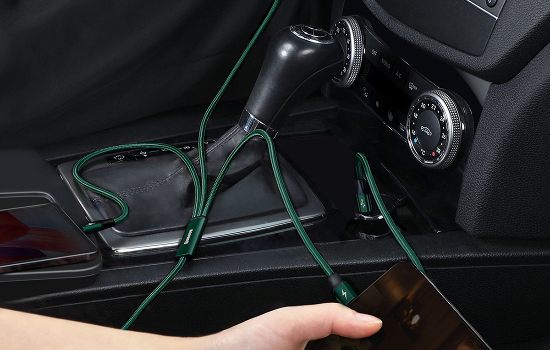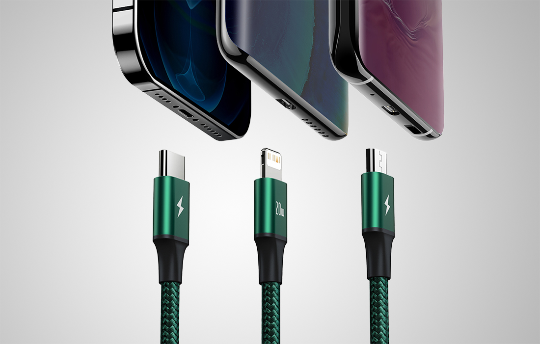 Jetzt können Sie bequem bis zu drei Geräte gleichzeitig laden. Das USB-C-auf-USB-C-, Lightning- und Micro-USB-Kabel der Marke Baseus ist nicht nur zu Hause, sondern beispielsweise auch im Auto einsetzbar. Es unterstützt Schnellladen (PD 20 W und 18 W) und ermöglicht die Datenübertragung mit bis zu 480 Mbit/s (nur über den Lightning-Anschluss). Es ist außerdem äußerst robust und langlebig – es wird Ihnen lange gute Dienste leisten.