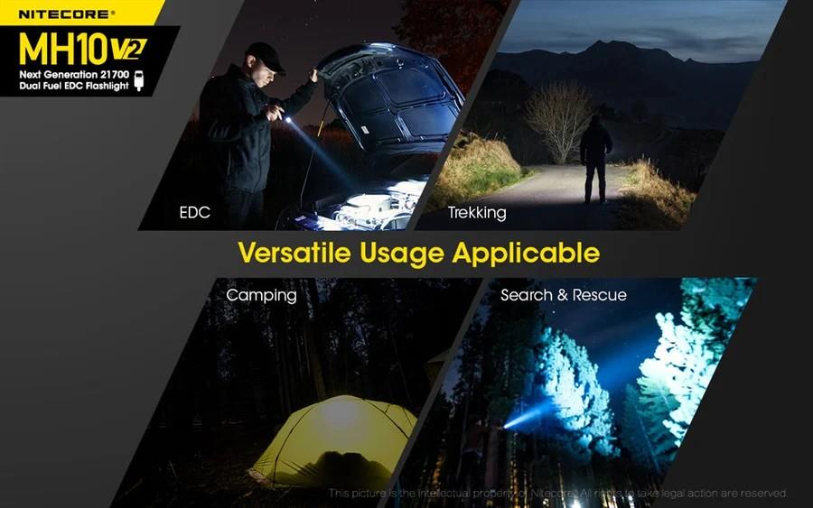 Triple the runtime and 20% brighter, yet still compact with more carry options, the Nitecore MH10 v2 is the quintessential upgrade of the classic rechargeable flashlight MH10. The 1200 lumen output at 220 yards of throw is a culmination of years of engineering and design. It also comes with four adjustable brightness levels as well as strobe, beacon, and SOS for emergencies and personal safety situations. MH10 v2 is a dependable workhorse with included 4000mAh 21700 battery and a USB-C fast charging port. Counting on its 3 hours and 45 minutes of runtime even in turbo to accomplish all of your tasks with time to spare. The MH10 v2 runs up to 62 days on low mode, making it a fantastic emergency light. At just over six inches in overall length, it remains a solid choice as a duty light or EDC flashlight with the included durable hard holster, pocket clip and lanyard. The MH10 v2 can handle whatever you throw at it with its premium quality: HA III aluminium construction, IPX8 waterproof rating, mode memory, and advanced temperature regulation. No matter whether you use it for daily tasks, or on patrol duty or search rescue missions, MH10 v2 is an indispensable companion day in and day out.