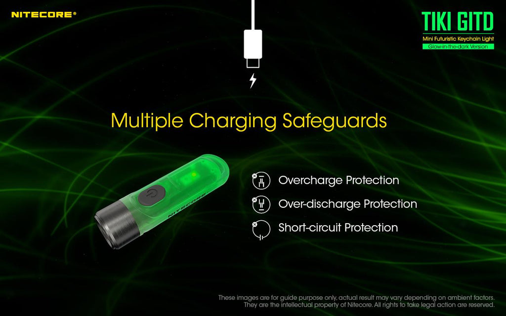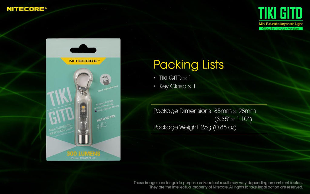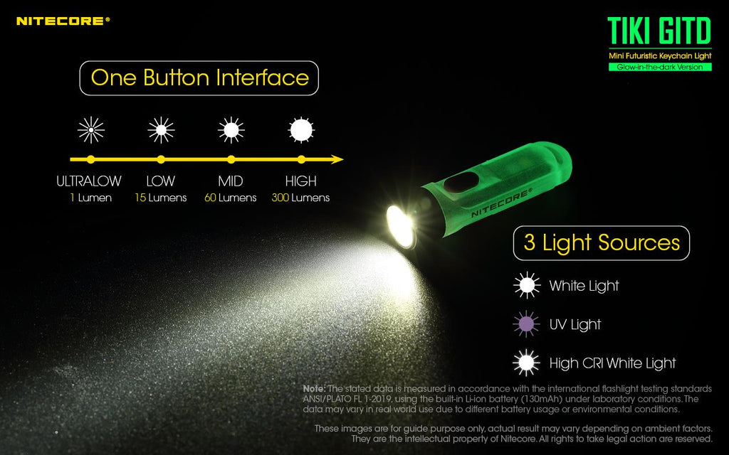 The Nitecore TIKI GITD keyring light features a phosphorescent shell which will glow in the dark. The torch has a maximum output of 300 lumens from the primary OSRAM P8 LED with a reflective optic lens emitting a soft, uniform beam. As with the Nitecore TIKI and TIKI LE torches, the TIKI GITD also offers two auxiliary emitters on the side of the light, a high CRI white LED and a 500mW, 365nm UV LED. The high CRI output is perfect for camping or reading and provides excellent colour rendition. The UV LED can be used as a detector of counterfeit notes and forged documents. In addition to the multiple light sources, the main LED features four brightness levels ranging from 1 to 300 lumens. All the modes and outputs are operated using the single side switch. The Nitecore TIKI GITD has a built-in 130mAh Li-ion battery which is rechargeable via a micro USB port at the base of the light, allowing for fast, convenient charging. The keyring torch has multiple charging safeguards including overcharge protection, over-discharge protection and short circuit protection, plus a blue charging indicator that turns off when the battery is fully charged. Brightness Levels: High: 300 lumens - 30 mins runtime Mid: 60 lumens - 1 hr runtime Low: 15 lumens - 4 hrs runtime Ultralow: 1 lumen - 40 hrs runtime UV: 500mW - 45 mins runtime Aux White Constant: 22 lumens - 1 hr 30 mins runtime Aux White Flashing: 22 lumens - 20 hrs runtime Maximum beam distance 71 meters, waterproof to IP66 and resistant to impacts up to 1 meter. Includes: Key Ring Clasp