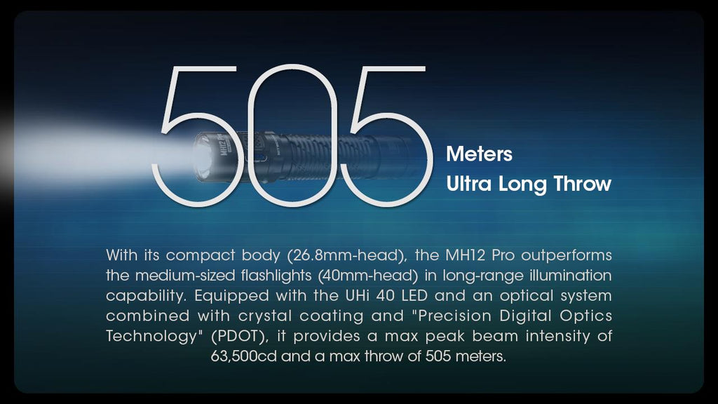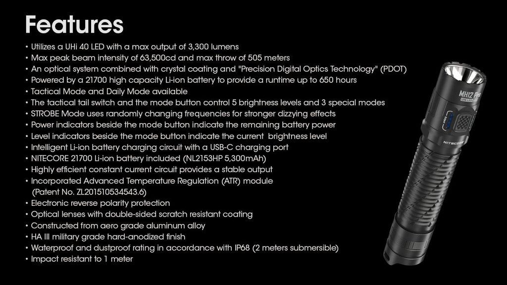NITECORE MH12 Pro 3300 Lumen USB-C Rechargeable Flashlight. The Nitecore MH12 Pro rechargeable flashlight is incredibly bright yet still compact enough to serve as a duty light to carry every day. With its innovative UHi 40 LED from NiteLab, the MH12 Pro boasts a 3300 lumen output and a 552 yard throw, farther than 4 football fields length added together. You'll be well-prepared for any situation with its five brightness levels, as well as strobe, beacon, and SOS modes. The MH12 Pro features a Tactical Mode with five lighting settings and strobe, while the Daily Mode offers the same settings plus a Beacon and SOS mode. Level indicators beside the mode button will help you identify the current brightness level. Moreover, the MH12 Pro includes a built-in optical sensor that automatically reduces brightness when it detects an obstruction at close range to prevent blinding reflection or overheating.
