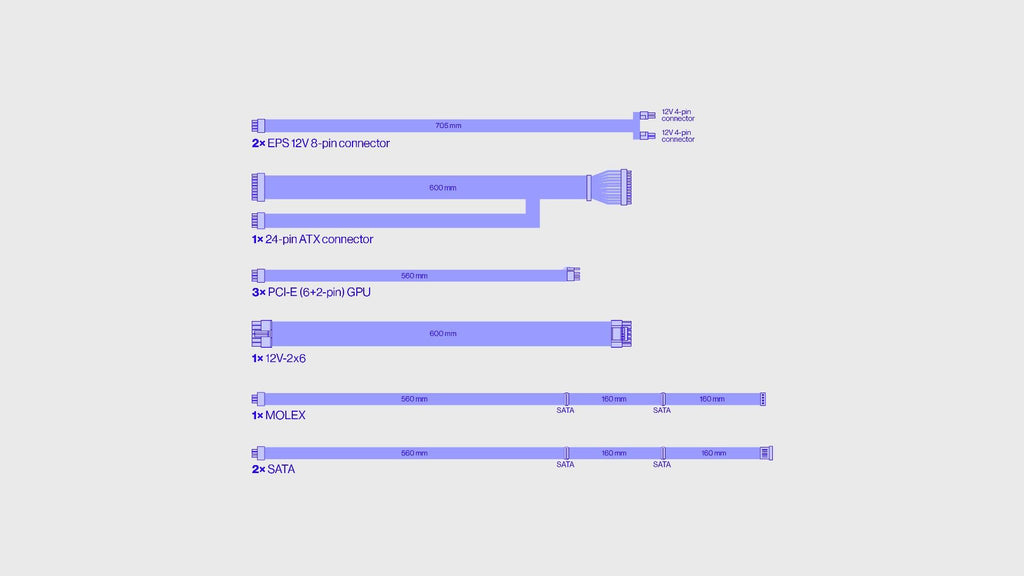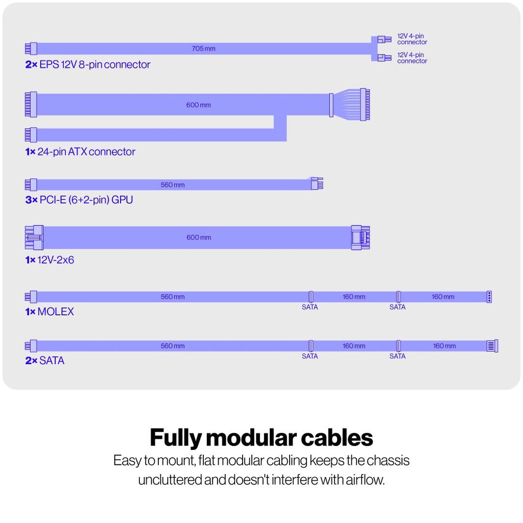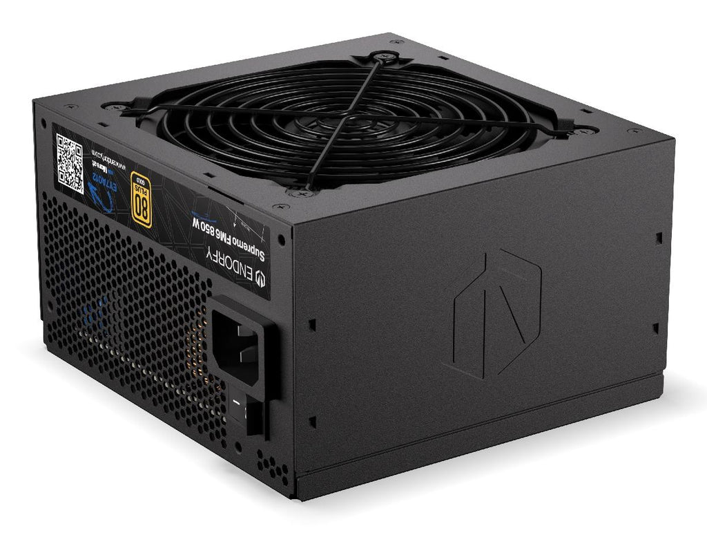 ENDORFY Supremo FM6 850 W. Total power: 850 W, AC input voltage: 100 - 240 V, AC input frequency: 50/60 Hz. Motherboard power connector: 24-pin ATX, SATA power cable length: 560 mm, Cabling type: Fully-Modular. Purpose: PC, Power supply unit (PSU) form factor: ATX, 80 PLUS certification: 80 PLUS Gold. Product colour: Black, Cooling type: Active, Fan diameter: 12 cm. Cables included: AC
