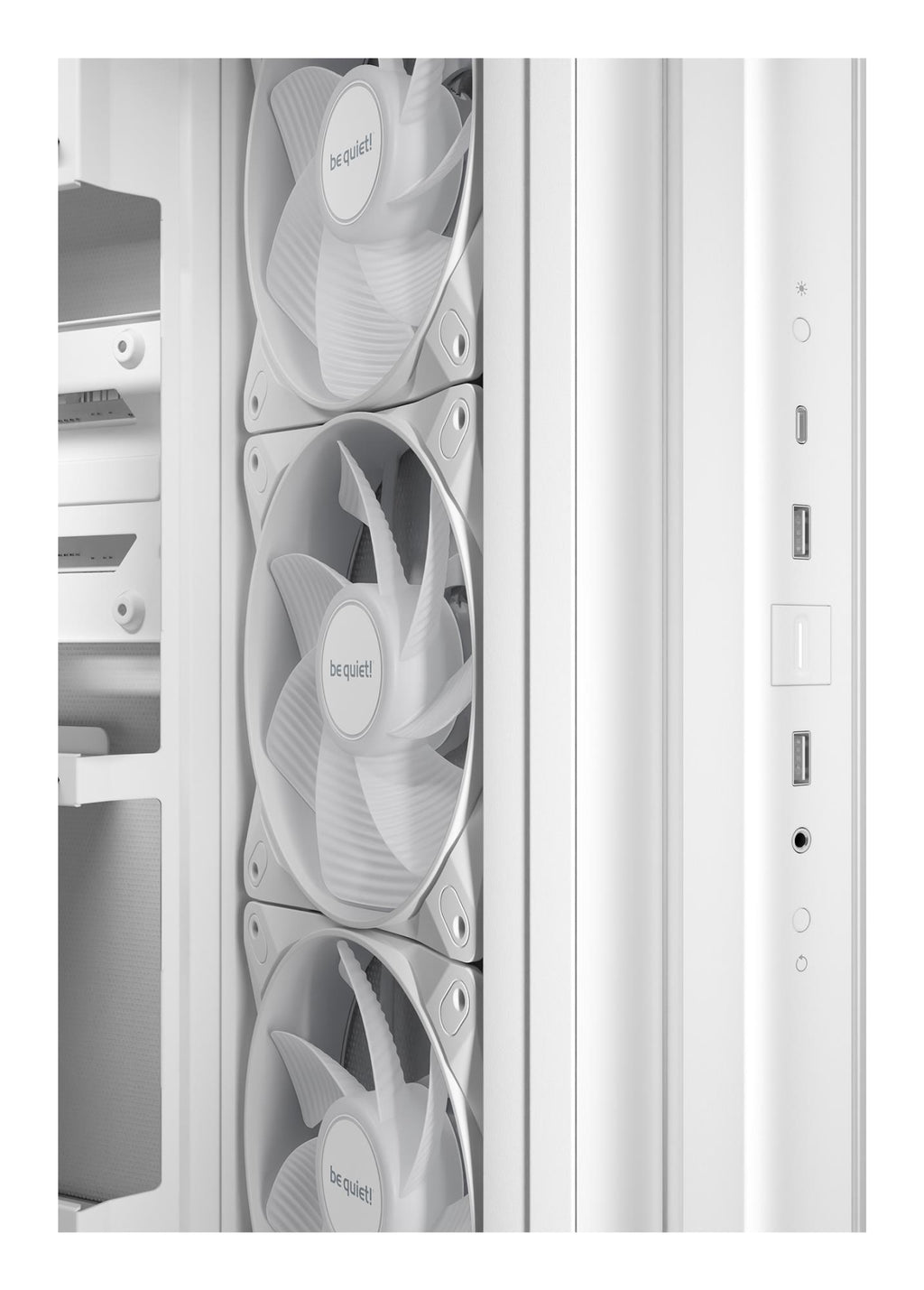 For those who appreciate subtle illumination without compromising on performance, the Light Base 500 LX White adds a touch of sophistication to the core design thanks to the included Light Wings LX White fans. An ARGB controller button with predefined lighting effects and colors is integrated into the I/O panel. The preinstalled rear fan and daisy-chained side fans are connected to a 6-way ARGB and PWM hub, leaving 4 free connectors for additional devices.