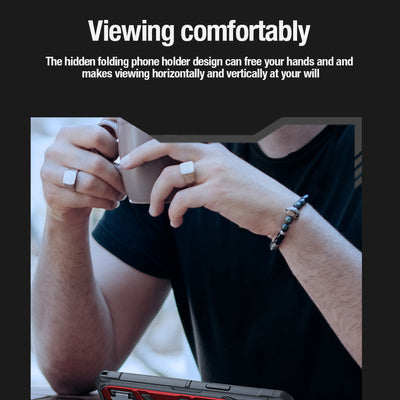 - It makes it easier to watch movies or read articles - without tiring your hands . It has a hidden stand that allows you to place the phone horizontally or vertically.