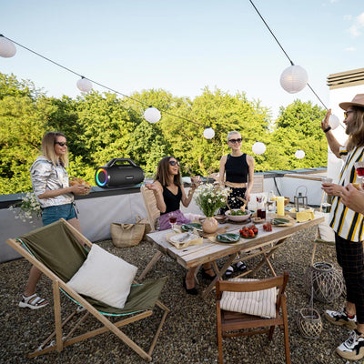 This powerful party speaker won't let you down even during the longest parties! Equipped with a solid battery, it allows for up to 24 hours of uninterrupted play. Now you can enjoy your favorite music all night long without worrying about charging. In addition, the speaker is moisture-resistant and has a waterproof level of IPX6, which means you can safely use it on the beach.