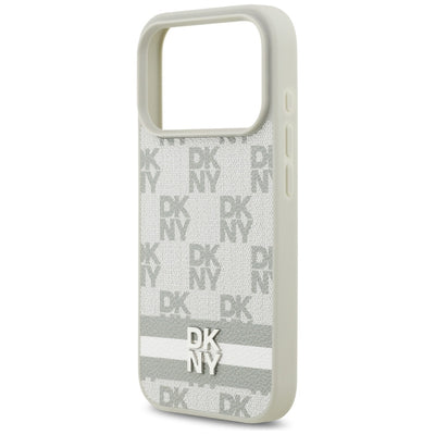 Each case is adorned with the exclusive initials of the exclusive DKNY fashion house, arranged in a unique checkered pattern. This pattern is distinctive and eye-catching thanks to its unique design. Wide stripes, matching the case's colors, further enhance the harmonious elegance. The entire design is finished with a metal DKNY logo, underlining the collection's prestige and authenticity.