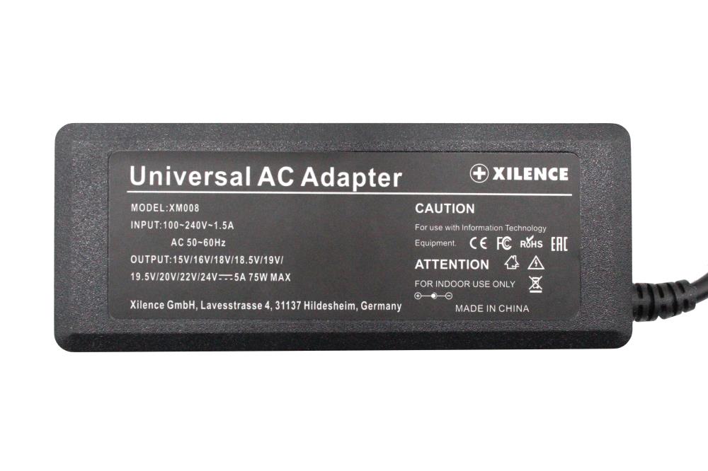 75W Mini When looking at the lightweight and extremely slim Xilence notebook PSU, it does not reveal its powerful interior. Nevertheless, the slim power pack has power with a stable output voltage of 24V. It achieves a remarkable eciency of over 85%. The compact power pack includes eleven plug adaptors in order to supply the most popular notebooks and netbooks with power. The integrated LED display shows information on the output voltage at all times. Full-range allows the power supply to be used worldwide. The PSU reliably operates at input voltages between 100V and 240V. Features: •full safety design: Over Voltage Protection (OVP), Over Current Protection (OCP), Over Temperature Protection (OTP), Short Circuit Protection (SCP) •11 coded, easy-to-install tips make easy chosing the right tip for your notebook •LED display on the adapter shows the actual output voltage