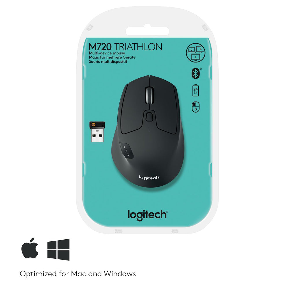 Logitech M720 Triathlon Mouse. Form factor: Right-hand. Movement detection technology: Optical, Device interface: RF Wireless + Bluetooth, Movement resolution: 1000 DPI, Buttons type: Pressed buttons, Buttons quantity: 8, Scroll type: Wheel. Power source: Batteries. Product colour: Black