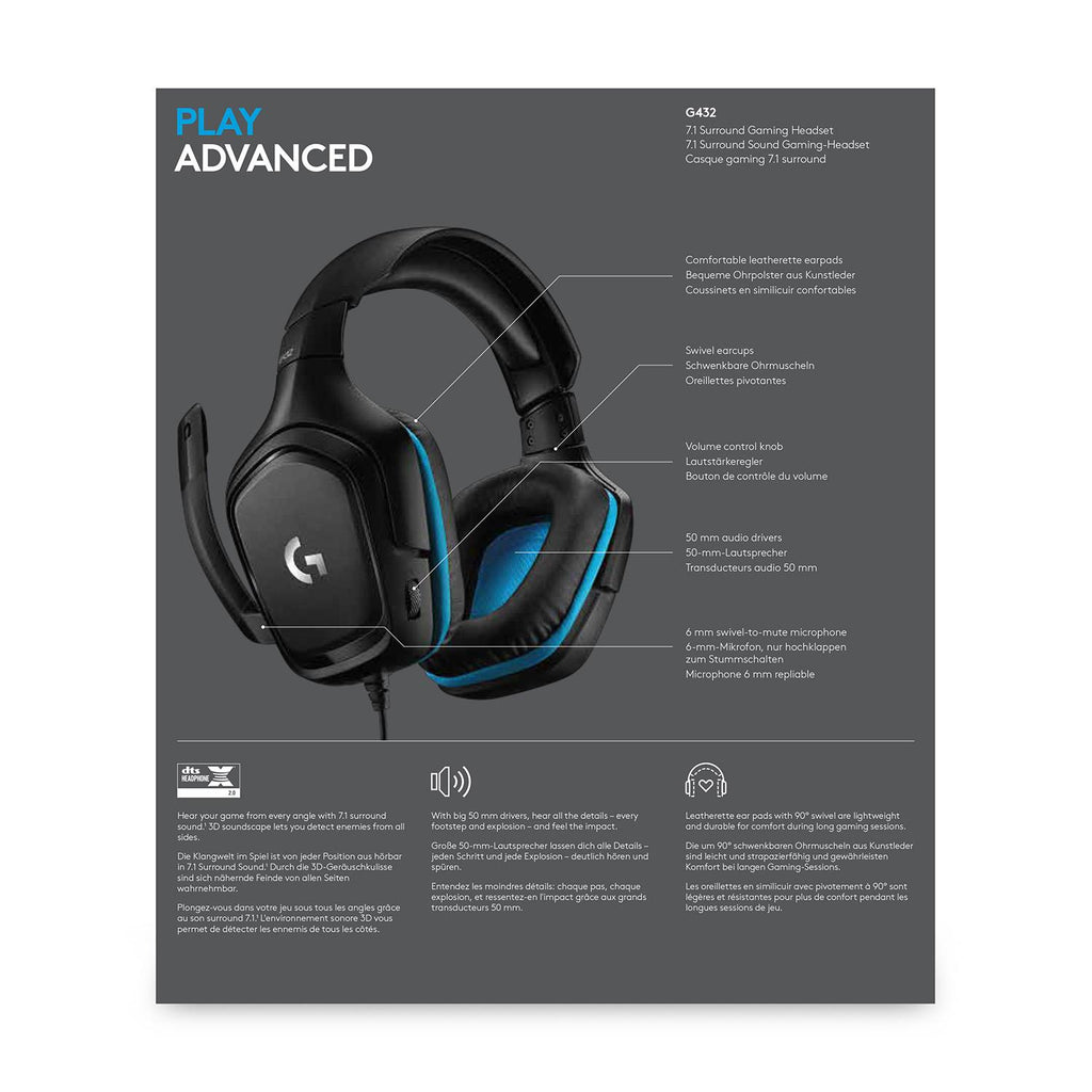 Logitech G G432 Gaming Headset. Product type: Headset. Connectivity technology: Wired. Recommended usage: Gaming. Headphone frequency: 20 - 20000 Hz. Cable length: 2 m. Weight: 280 g. Product colour: Black, Blue
