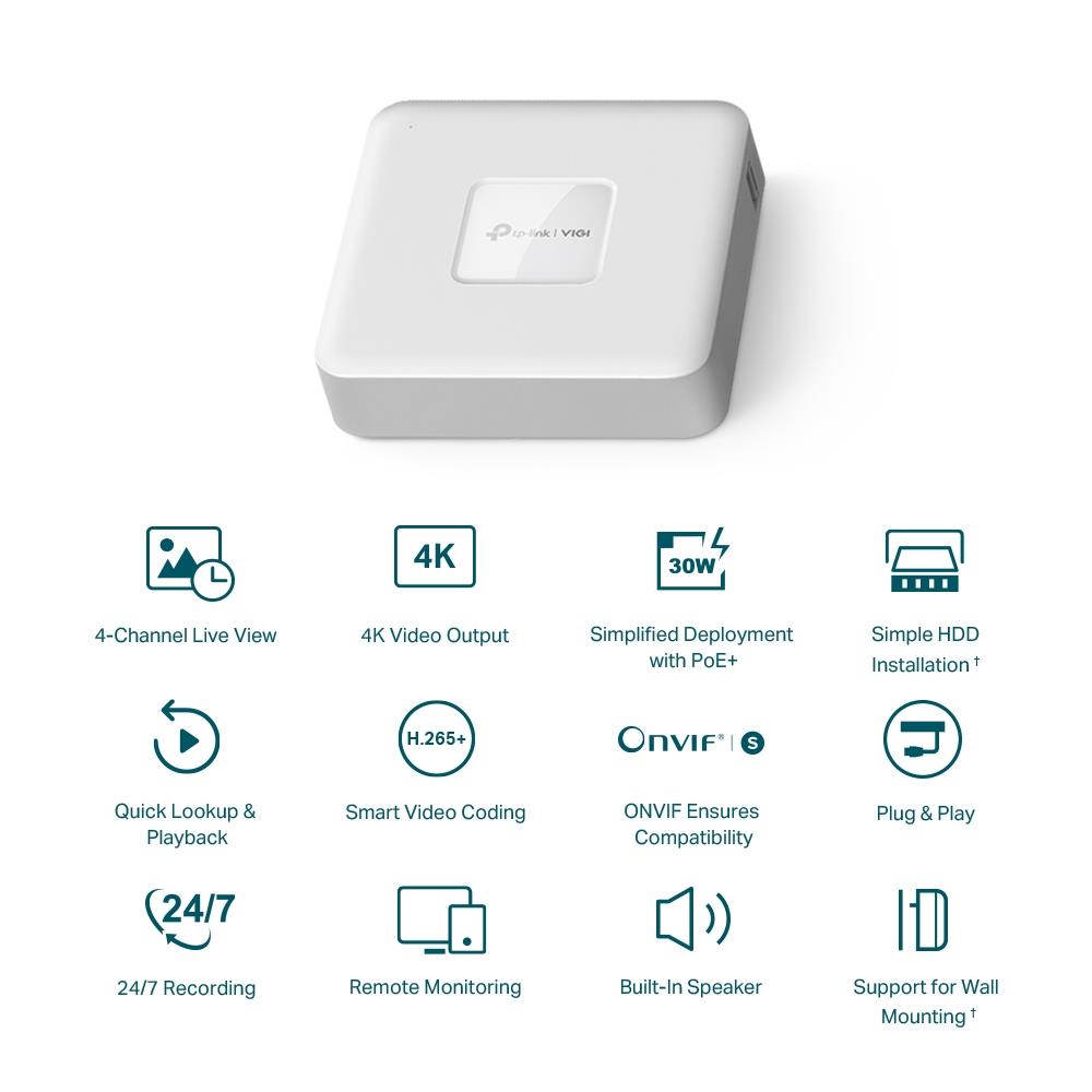 VIGI 4 Channel PoE+ Network Video Recorder 4K HDMI Video Output & 16MP Decoding Capacity: Sharp image definition up to 8MP and a 4-channel display ensures you capture every detail, from every angle‡. Simplified Deployment with PoE+: Easily connect and power your PoE camera with one RJ45 cable transmitting both data and power. No power adapter needed. Simple HDD Installation†: Install and remove the HDD manually with easy side access. 4-Channel Simultaneous Playback△ : Replay the feed from up to 4 cameras at the same time, increase replay speed, and find events in the video schedule to easily review footage. H.265+: Without using any extra bandwidth, your camera transmits compressed crystal-clear video to save disk space, ease network loads, and reduce monitoring costs without sacrificing image quality. ONVIF Ensures Compatibility*: Easily add IPCs from VIGI and other brands to establish a powerful and varied network thanks to barrier-free compatibility. Plug & Play: Allows new and unused VIGI IP Cameras to be added automatically to the new NVR and activated instantly, making installation faster than ever before. 24/7 Continuous Recording: Stores up to 10 TB of footage from connected cameras to secure your data for quick, convenient access. Remote Monitoring: The dedicated VIGI app, web UI, and VIGI Security Manager enable remote monitoring, providing ease and convenience. Built-In Speaker: Enjoy real-time audio output without needing peripherals for greater convenience. Flexible Installation: Choose the suitable installation method by simply mounting your NVR on the wall, or placing it on or under a desk.