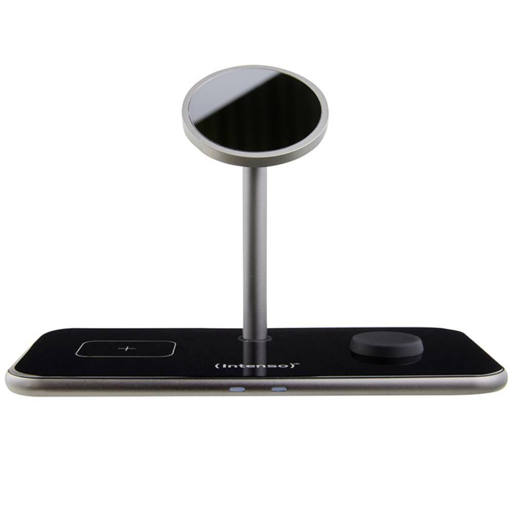 INTENSO MB13 3in1 Magnetic Wireless Charger Dein Eines für Alles. Tschüss Kabel-Chaos, hallo gleichzeitiges Laden Entdecke die ultimative Ladefreiheit mit dem 3in1 Magnetic Wireless Charger. Lade Dein Smartphone, Deine Apple Watch und Deine Earbuds gleichzeitig auf – ganz ohne lästiges Kabelgewirr. Dank des Schnellladesystems sind Deine Akkus im Handumdrehen einsatzbereit. Deine MagSafe™-kompatiblen Geräte (iPhone 12 und neuer) werden automatisch am magnetischen Standfuß fixiert und perfekt positioniert. Zwei Smartphones gleichzeitig aufladen? Kein Problem. Deine Qi-fähigen Telefone lädst Du mit der zweiten Schnellladefläche. Kabellos, extrem schnell und unglaublich vielseitig – so lädst Du heute auf. Deine Zeit ist kostbar. Schnellladetechnologie auf all Deine Geräte abgestimmt Ausgestattet mit einem USB-C Kabel und einem Schnellladeadapter bietet der 3in1 Magnetic Wireless Charger Ladepower von bis zu 15 Watt. Der Ladevorgang ist intelligent auf das aufgelegte Gerät optimiert, um den Akku besonders schonend und gleichzeitig mit maximaler Ladegeschwindigkeit zu laden. In kürzester Zeit ist Dein Smartphone wieder zu 100 % aufgeladen. Profitiere von modernster Ladetechnologie, die das Maxmimum aus Deinen Geräten herausholt. Zeig Stil, während Du lädst Die perfekte Ergänzung für dein Zuhause und dein Büro: eine Fusion aus Ästhetik und Technologie. Mit seinem eleganten High-End-Design, dem hochwertigen Aluminiumgehäuse und einer Oberfläche aus gehärtetem Glas ist der Magnetic Wireless Charger MB13 nicht nur funktional, sondern auch ein echter Blickfang.