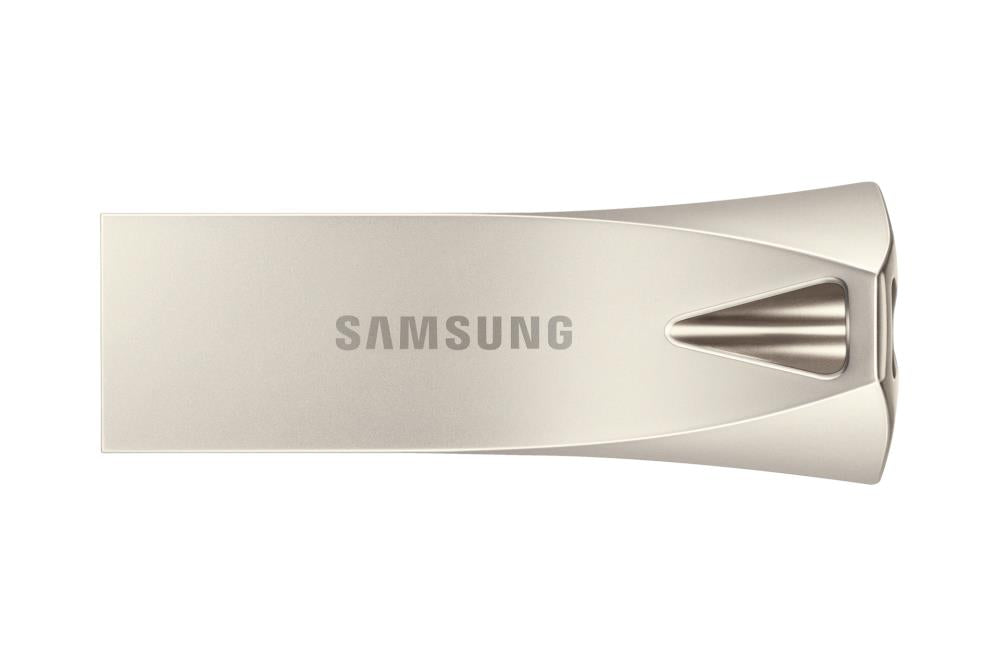 SAMSUNG BAR Plus USB Flash Drive 512GB Fast transfer speeds Delivers sequential read speeds of up to 400 MB/s through its USB 3.2 Gen 1 interface, transferring 4GB files in a approximately 9 seconds. Wide compatibility Compatible with PCs, Macs, smart TVs, and cars via USB Type-A ports for seamless save, transfer, and play across devices. Reassuring reliability Safeguards data from water, extreme temperatures, x-rays, magnetic fields, and shock, making it well suited for on-the-go usage. Pack it all in Plenty of room for the peace of mind you need. With storage capacities ranging to 512GB, you'll have space to store up to 170,251 photos or a full 24 hours of 4K video, whichever suits your preference. Speed for any occasion Have your files ready right when you need them. BAR Plus transfers 4GB files in approximately 9 seconds with sequential read speeds of up to 400 MB/s, supported by the USB 3.2 Gen 1 standard. It's also backward compatible, allowing you to connect it to any USB 2.0 port. Flair in every move Pairing a minimalistic, elegant design with a robust metal body, BAR Plus not only performs exceptionally but also looks good. The integrated keyring loop makes it easy to carry wherever you go, seamlessly blending style with practicality. Connect with confidence Wherever you go and whatever device you use, BAR Plus enhances efficiency with its extensive compatibility. Whether saving files on an office PC, playing videos on your home TV, or enjoying your favourite playlist in the car on the move, it gets the job done swiftly and reliably.