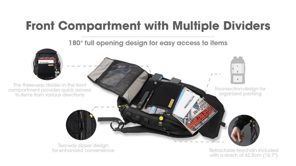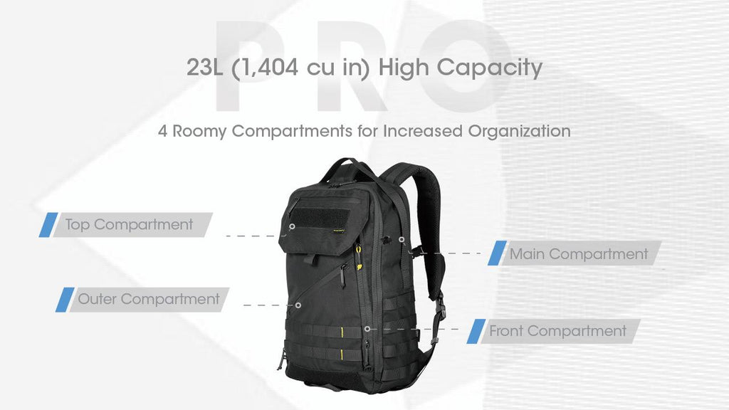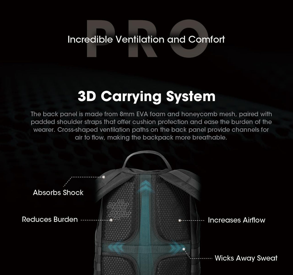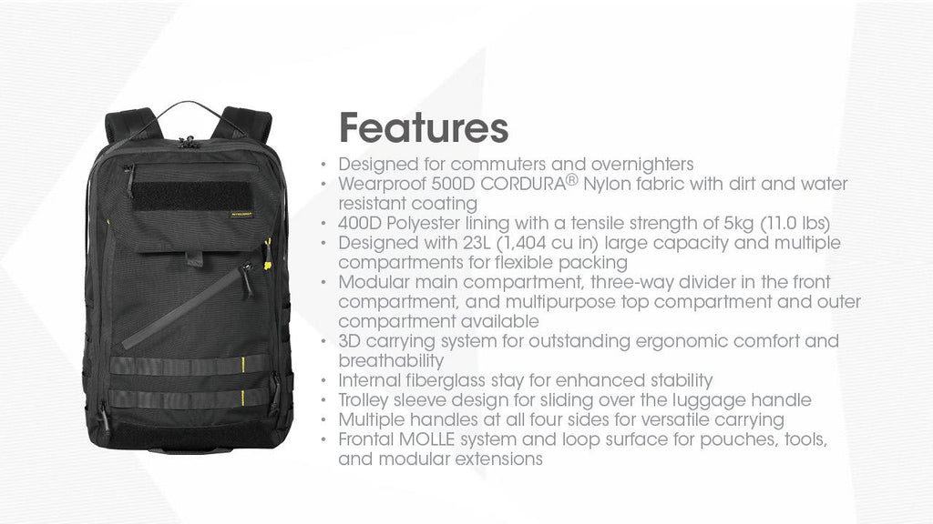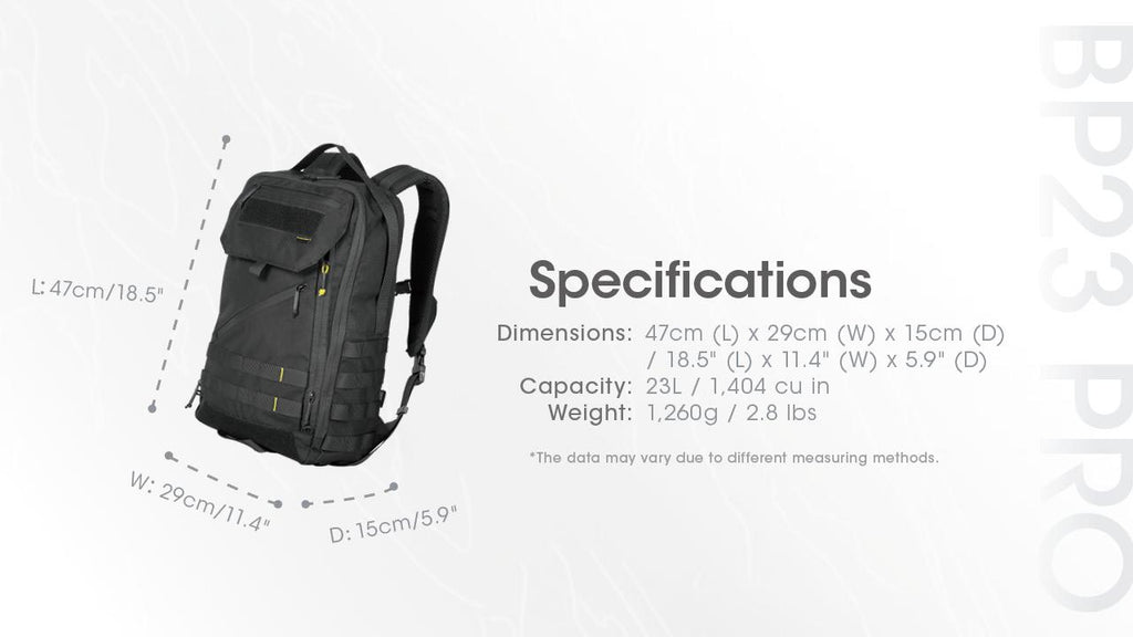 The Nitecore BP23 Pro Tentacle backpack offers a 23L capacity, 3D carry system, modular main compartment and durable Cordura nylon fabric construction. The bag offers 4 spacious compartments, including the main, top, outer and front sections. The main compartment provides fantastic organisational options with a laptop section, a modular loop surface, dual internal side pockets and a mesh zippered pocket in the front. The front compartment has a 180° full opening design for easy access to your items. The back panel of the BP23 Pro is made from 8mm EVA foam and honeycomb mesh and is paired with padded shoulder straps that offer cushioned comfort. Cross-shaped ventilation paths on the back panel provide channels for air to flow, making the backpack more breathable. It also features a 3mm internal fiberglass layer on the back panel, preventing it from being compressed from top to bottom or side to side. Externally the BP23 Pro has a range of versatile features, including a loop surface, MOLLE system webbing, a strap mounting area, high quality straps and zippers and multiple handles at four side for comfortable and convenient carry. The 500D Cordura fabric provides excellent tear strength and is resistant to water, wear and abrasion. It is 3 times more durable than ordinary polyester fabrics and 10 times more than canvas. Wearproof 500D Cordura nylon fabric with dirt and water resistant coating 400D polyester lining with a tensile strength of 5kg (11 lbs) Designed with 23L large capacity and multiple compartments for flexible storage Modular main compartment, 3-part divider in front compartment, multipurpose top and outer compartments 3D carrying system for outstanding ergonomic comfort and breathability Internal fiberglass panel for enhanced stability Trolley sleeve design for sliding over the luggage handle Multiple handles at all four sides for versatile carrying Frontal MOLLE system and loop surface for pouches, tools and modular extensions