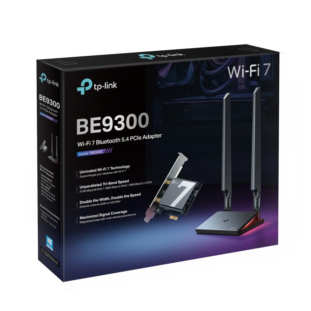 Archer TBE550E BE9300 Wi-Fi 7 Bluetooth 5.4 PCIe Adapter Unparalleled Tri-Band Speed — Boost your overall speeds up to 5760 Mbps (6 GHz) + 2880 Mbps (5 GHz) + 688 Mbps (2.4 GHz) Wi-Fi 7 Standard — Unleash the full potential of the 6 GHz band to double the bandwidth of the last generation. Wider Signal Coverage — Two multi-directional antennas with a magnetized base are designed for optimal signal reception. Reliable Bluetooth 5.4 – Security and reliability improvement than last-gen high-speed Bluetooth 5.3 Improved Security – The latest security enhancement, WPA3, provides enhanced protection in personal password safety. Fast Installation with USB Drive — Plug in the resource USB drive provided with Archer TBE550E to quickly drive without network. Enjoy the simple and friendly adapter installation. Multicolor Wi-Fi Status Lighting — Equipped with vibrant LED lighting effects, the base provides an intuitive indication of network status, enhancing both functionality and aesthetics.
