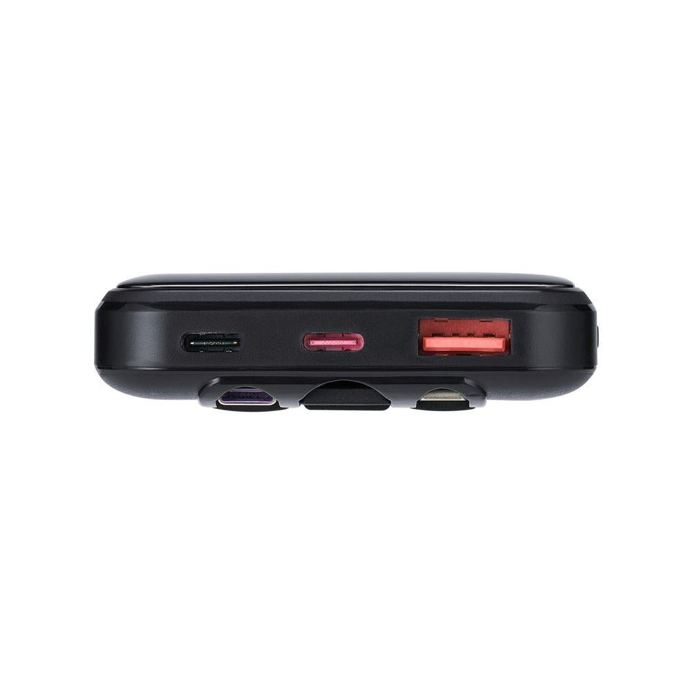 Rivapower VA2211 (10000 mAh) black, QC/PD 3 built-in cables Portable fast charge battery with built-in cables Product Features: • 10000 mAh rechargeable Li-Pol battery. • Display shows the level of charge. • Over-charging, over-discharging, overload and short circuit protection • Automatic turn on/off. Just plug your device(s) into RIVACASE battery output socket(s) and the charging will start. • Smartphone charging - up to 2 times. KEY FEATURE: • 3 built-in cables - no need to search for the right cable to charge your phone! • Fast charge up to 22,5W • recharging via USB-A or USB-C built-in cables