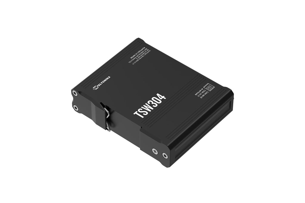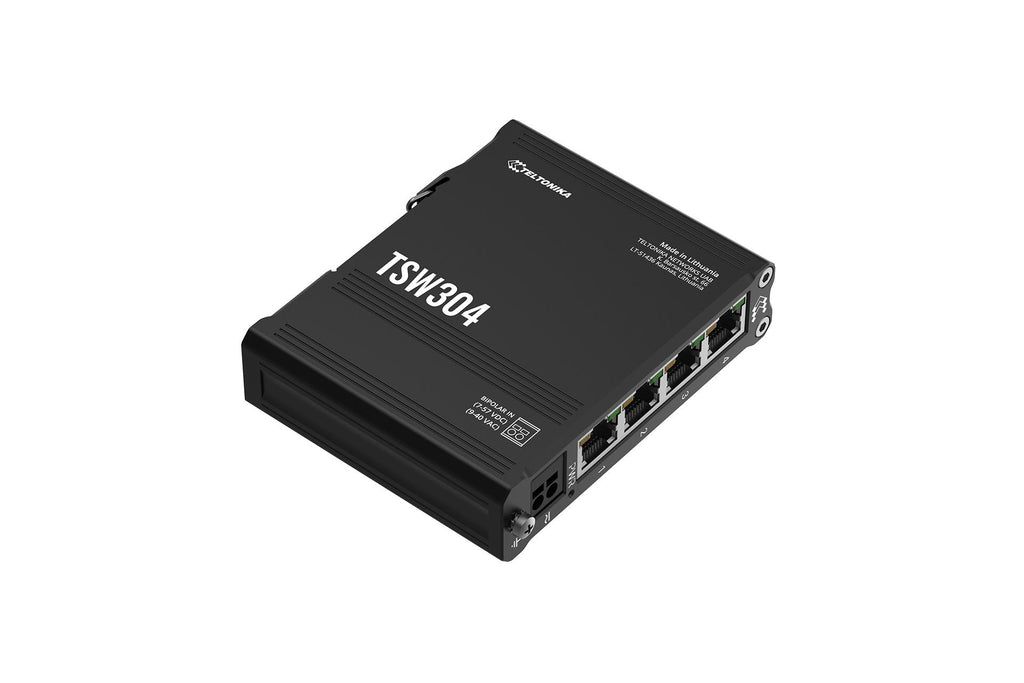 TSW304 DIN RAIL ETHERNET SWITCH TSW304 is the tiniest Ethernet switch in the Teltonika Networks portfolio, made with the industrial application scenarios in mind. This ultra-small device comes with an integrated DIN rail mounting option and will easily find its place in any server cabinet. Durable design and shock-resistant casing make it perfect for even the most challenging industrial environments.