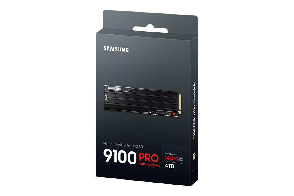 Samsung 9100 PRO Heatsink PCIe® 5.0 NVMe™ M.2 SSD - 4 TB. SSD capacity: 4 TB, SSD form factor: M.2, Read speed: 14800 MB/s, Write speed: 13400 MB/s, Component for: PC/Game console
