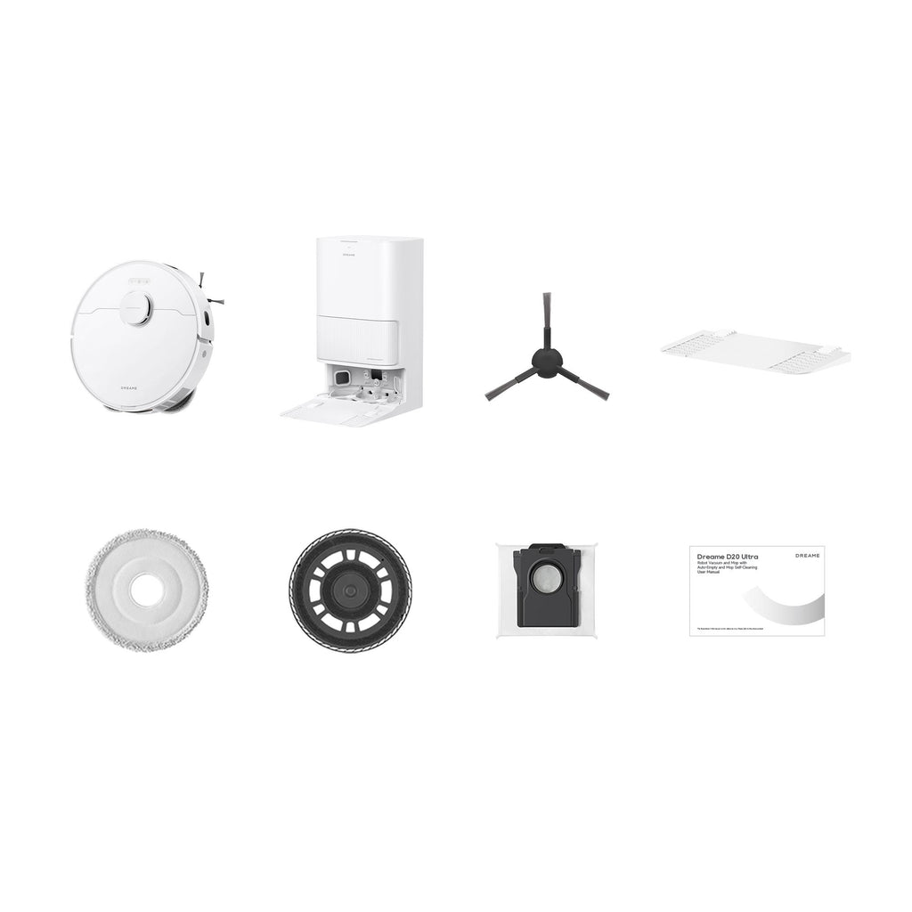 Dreame D20 Ultra. Dust container type: Dust bag, Product colour: White, Shape: Round. Dust capacity (total): 3.595 L, Dust capacity (vacuum cleaner): 0.32 L, Dust capacity (base): 3.2 L. Battery capacity: 5200 mAh, Runtime: 230 min, Battery life: 214 m². Height: 104 mm, Width: 350 mm, Depth: 350 mm