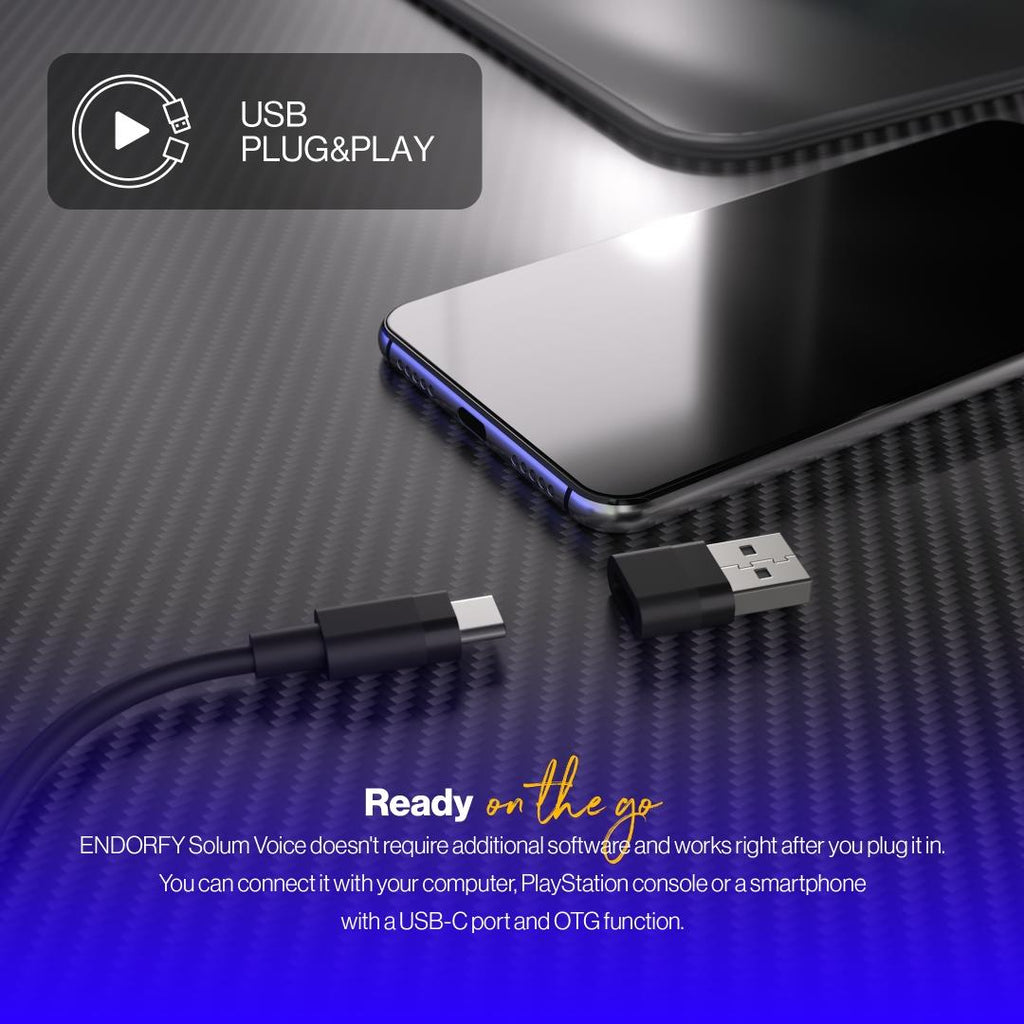 ENDORFY Solum Voice. Type: PC microphone, Microphone frequency: 30 - 18000 Hz, Bit rate: 24 bit. Connectivity technology: Wired, Device interface: USB/3.5 mm, USB connector type: USB Type-C. Product colour: Black, Market segment: Consumer, Control type: Buttons, Rotary. Power source: USB. Width: 30 mm, Height: 135 mm