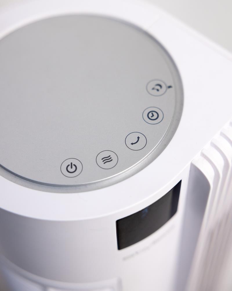 Also impressive are the intelligent features such as a timer (1–8 hours), 3 wind modes, 4 speed levels, manually adjustable wind vanes for vertical wind direction, and a convenient remote control. The elegant LED display also shows the current room temperature. A grille protects children's fingers from injury.