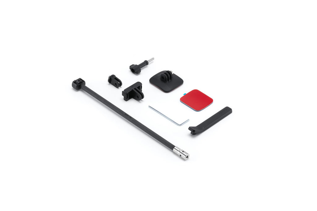 Osmo Third-Person Helmet Mount Kit. The curved base fits snugly against the helmet and adheres firmly to stay in place. Paired with a high-strength carbon fiber straight rod, it enables a distinctive third-person tracking perspective. In The Box: Osmo Curved Adhesive Base Max × 1, 28 cm Carbon Fiber Straight Rod × 1, 1/4" Thread to Dual Prong Adapter × 1, Osmo Action Quick-Release Adapter Mount × 1, Osmo Locking Screw × 1, Screw Locking Wrench × 1, Hex Key × 1