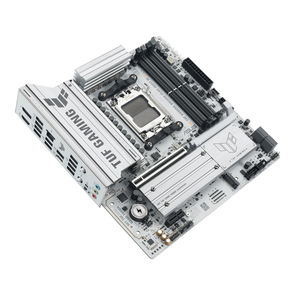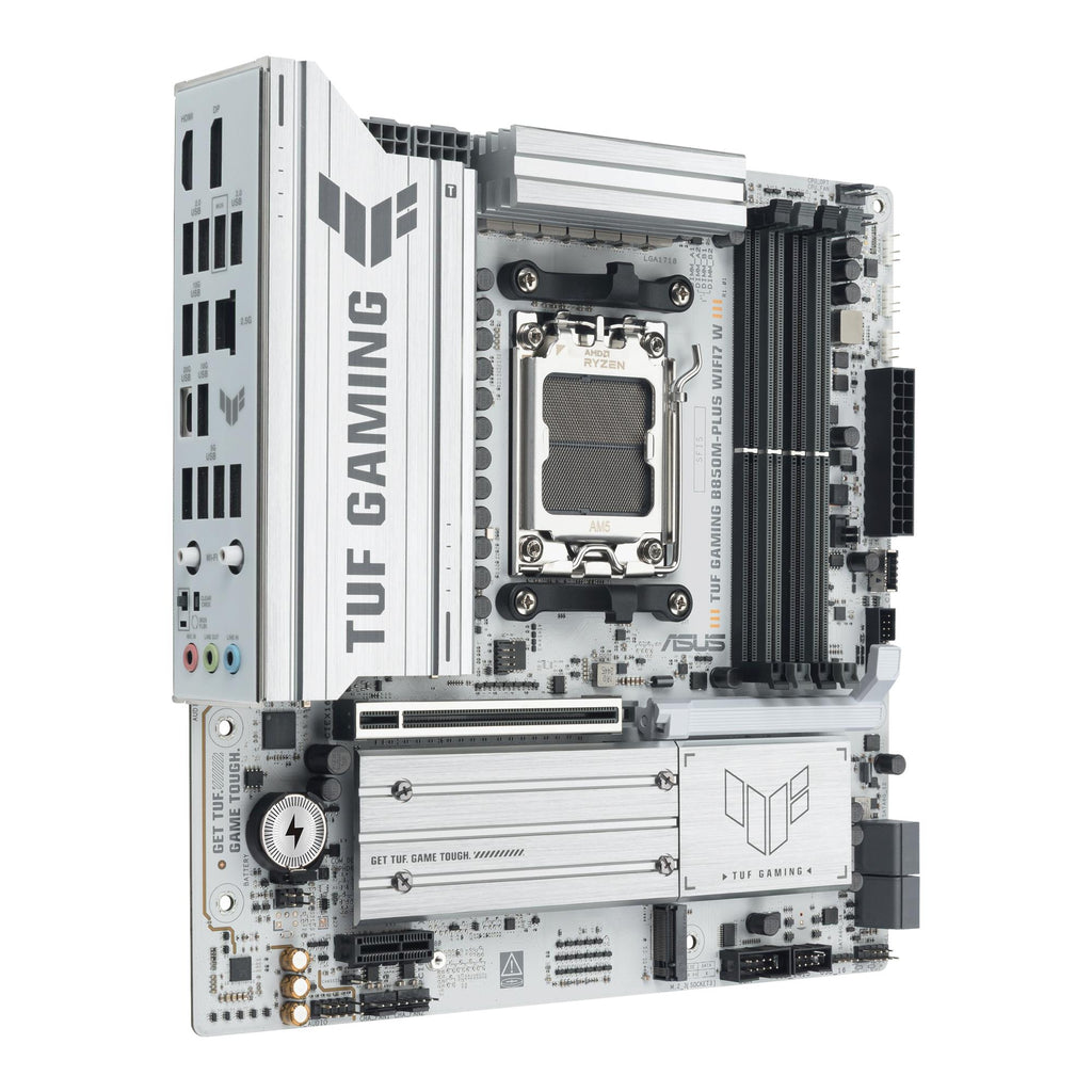 TUF GAMING B850M-PLUS WIFI7 W ASUS TUF GAMING B850M-PLUS WIFI7 W takes all the essential elements of the latest AMD Ryzen™ processors and combines them with game-ready features and proven durability. Engineered with military-grade components, an upgraded power solution and a comprehensive cooling system, this motherboard goes beyond expectations with rock-solid and stable performance for marathon gaming. TUF GAMING motherboards also undergo rigorous endurance testing to ensure that they can handle conditions where others may fail. This platform delivers the power and connectivity that advanced AI PC applications demand.