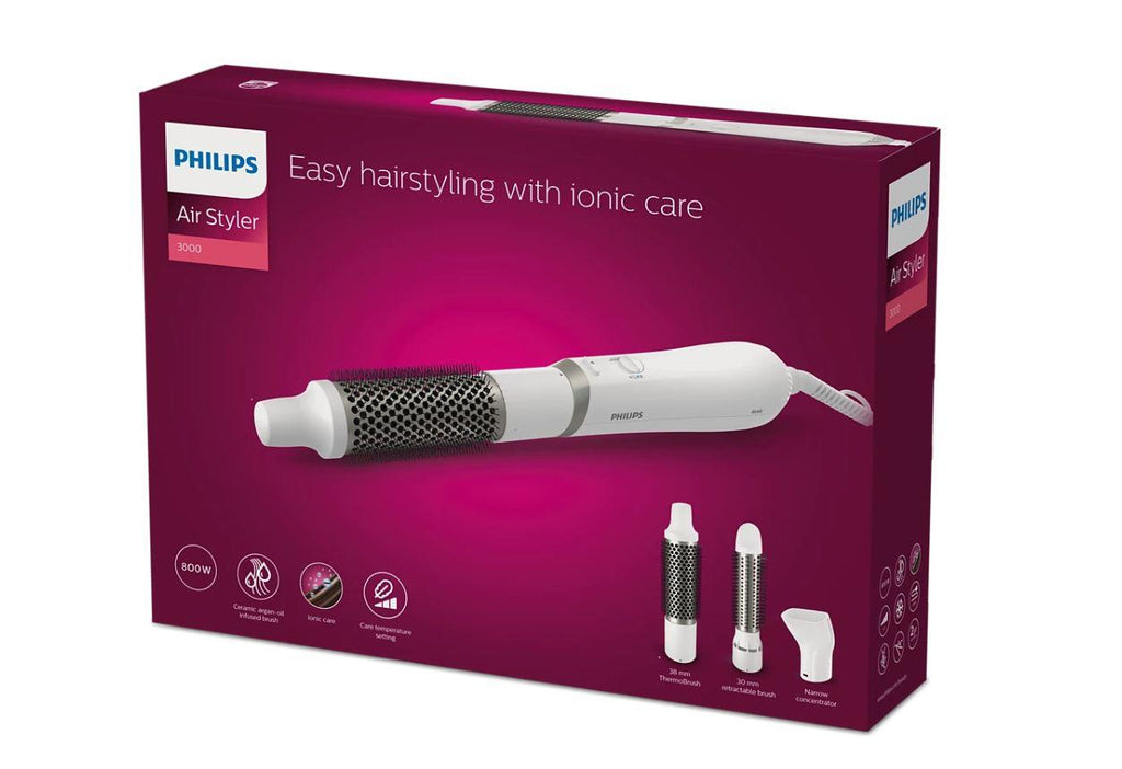 3000 Series Air Styler Easy hair styling with ionic effect Dry and style in an instant - the Philips Air Styler 3000 lets you create beautiful, natural hairstyles while providing extra shine with ionic action. The 3 included attachments are suitable for both long and short hair, so you can style it with ease.
