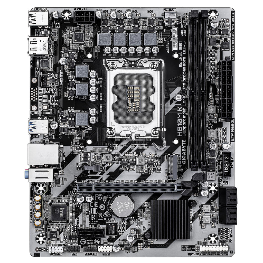 GIGABYTE H810M K Motherboard - Intel Core Ultra (Series 2) CPUs, 3+1+2 Phases VRM, up to 6400MHz DDR5, 1xPCIe 4.0 M.2, 1GbE LAN, USB 3.2 Gen 1. Processor manufacturer: Intel, Processor socket: LGA 1851 (Socket V1), Compatible processor series: Intel Core Ultra (Series 2). Supported memory types: DDR5-SDRAM, Maximum internal memory: 128 GB, Memory slots type: DIMM. Supported storage drive interfaces: M.2, PCI Express 4.0, SATA III, Supported storage drive types: HDD & SSD, RAID levels: 0, 1, 5, 10. Maximum resolution: 4096 x 2160 pixels. Ethernet interface type: Gigabit Ethernet, LAN controller: Realtek RTL8111H
