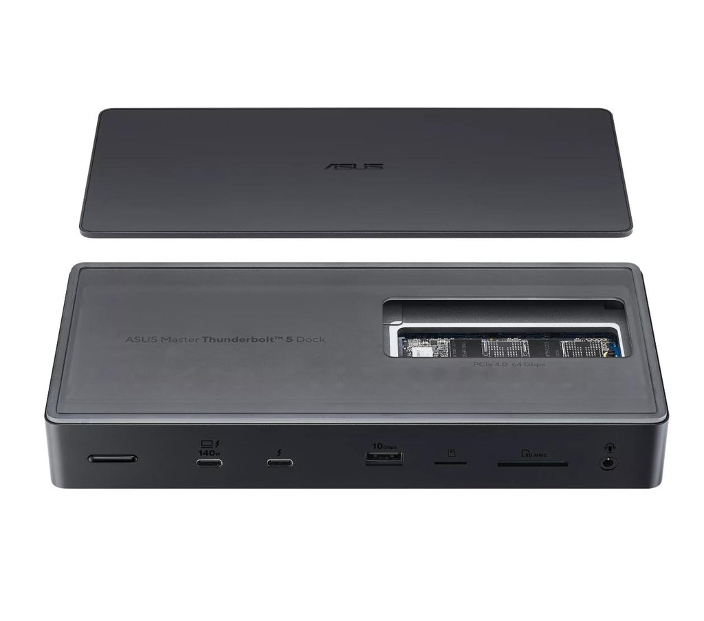 ASUS Master Thunderbolt™ 5 Dock Unleash lightning-fast potential ASUS Master Thunderbolt™ 5 Dock is a 13-in-1 dock designed for creators, giving them the ability to turn their laptop into a powerful workstation with just a single cable connection. The dock is able to support up to three 4K displays, super 80Gbps data transfer speed via three Thunderbolt 5, read two memory cards, and even includes an SSD slot for additional storage. Built-in LEDs on the underside of the device offer adjustable ambient lighting to add a futuristic aesthetic to any creative space.