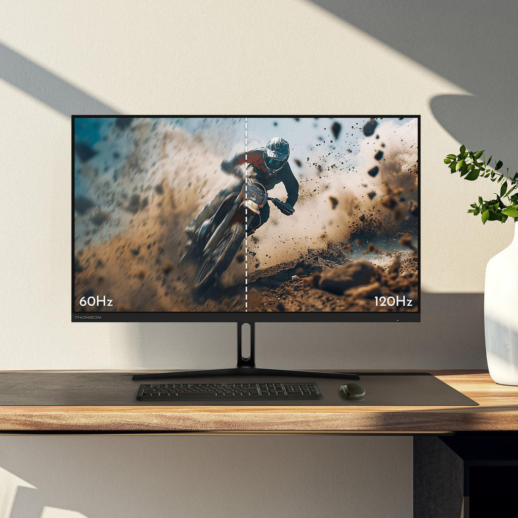 Experience a new level of productivity with the THOMSON 27-inch Suite Business Monitor, combining useful technology with user-friendly features. Equipped with a 27-inch IPS panel, this monitor delivers vibrant colours and deep contrasts, making it ideal for enhanced productivity and multimedia tasks. With a Full HD resolution and a brightness of 300 nits, every image comes to life with clarity and brightness, ensuring sharp visuals in any lighting condition. Anti-Flicker, Anti-Glare and Low Blue Light features ensure a comfortable viewing experience, reducing eye strain even after prolonged use. With the 178° wide viewing angle, 110% of the sRGB colour gamut and HDR10 with 8-bit colour depth, this monitor delivers accurate and rich colours, perfect for design and content creation. The 120 Hz refresh rate and compatible Adaptive Sync technology provide fluid motion, eliminating screen tearing and stuttering during fast-paced tasks. The HDMI and Type-C inputs offer versatile connectivity options for modern devices.