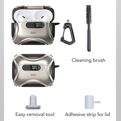 The Slide to Open mechanism allows for instant access to your earbuds—simply slide the front slider to unlock the magnets and the cover automatically opens for one-handed use. The built-in MagSafe system ensures a stable connection with MagSafe chargers, making wireless charging fast and convenient. It's complemented by strong 360° protection—shock-resistant material and reinforced Air Guard corners effectively protect the charging case from drops and impacts.