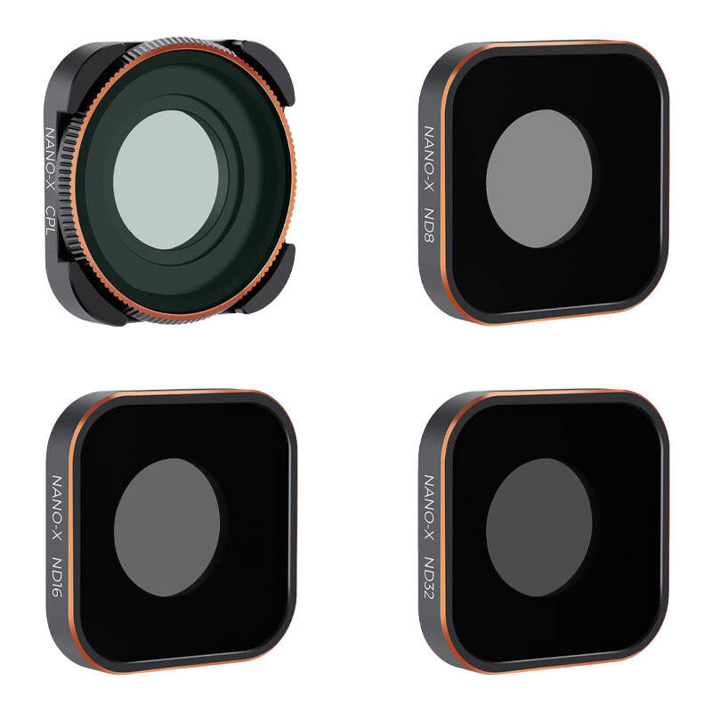 The set includes a CPL filter and 3 types of ND filters. Each of them works perfectly in different scenarios. For example, the CPL filter reduces glare and highlights the blue color of the sky - you will successfully use it for landscape photography. The ND8 (3-degree) filter will find use on cloudy days, and the ND16 (4-degree) filter will be an excellent choice for recording in ordinary daylight. The ND32 (5-degree) filter, on the other hand, is best suited for filming in bright sunlight.