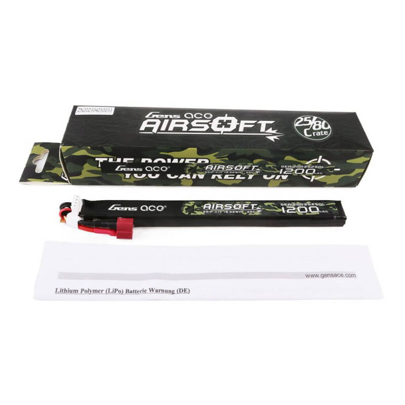 The Gens Ace 25C 1200mAh 3S1P 11.1V Airsoft Gun Lipo Battery with T Plug Connector is specially designed to power airsoft gun replicas. With a 1200mAh capacity and 11.1V voltage, it provides stable power during prolonged battles. The 25C discharge rate guarantees reliable performance even during heavy use. Ideally suited for weapon replicas that have a larger battery space.