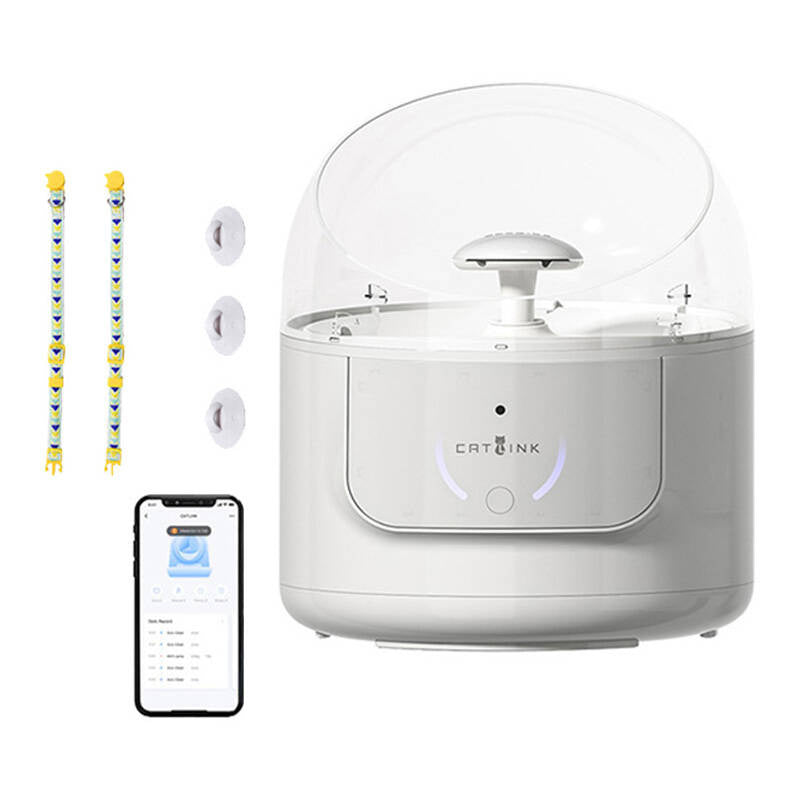 The ceramic bowl of the Catlink smart fountain is anti-bacterial and safe to use. What's more, the modular design makes it easy to clean. The unit is also resistant to water and corrosion, and the ABS plastic construction ensures optimal weight and provides stability. Meanwhile, the semi-circular cover makes it easy to keep clean and prevents water splashing. In addition, the device operates quietly (<35 dB), and the tank capacity is 2.3 liters, reducing the frequency of refilling to about 2 weeks (for 1 cat).